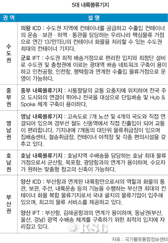 정부와 민간이 저비용 고효율 물류체계 구축을 위해 전국 5대 권역별(수도권, 중부권, 호남권, 영남권, 부산권)로 조성한 대규모 물류시설인 내륙물류기지는 복합화물터미널(IFT)과 내륙컨테이너기지(ICD)로 구성돼 화물의 집하, 보관, 배송, 통관 업무를 한곳에서 처리하고 있다.