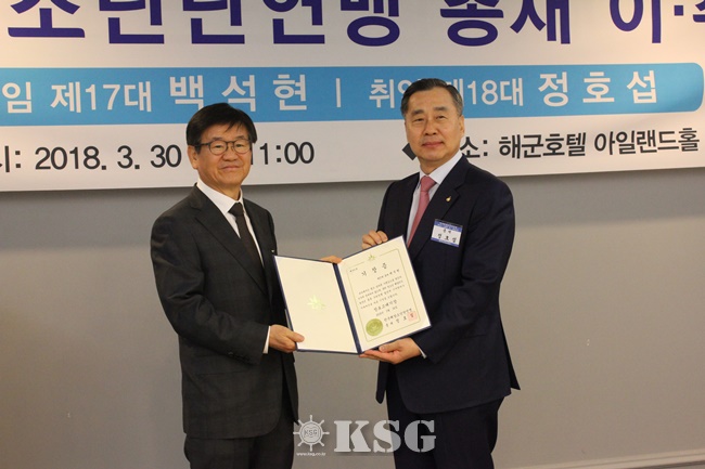 | ▲ 18대 정호섭 총재(사진 오른쪽)가 17대 백석현 총재에게 장보고대기장을 수여하고 있다. |