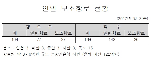 지난해 말 현재 보조항로로 지정된 곳은 전체 104개 연안항로 중 27곳이다. 목포를 거점으로 하는 항로가 15개로 가장 많다.