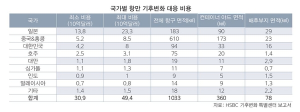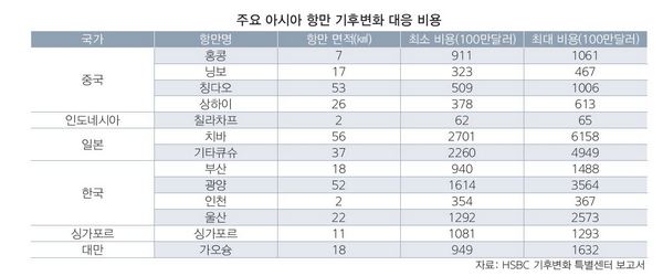 홍콩 HSBC은행의 기후변화 특별센터가 아시아·태평양 지역 53개 항구를 대상으로 조사한 기후변화 대응 비용은 최대 51조8500억원(490억달러)에 이르는 것으로 분석됐다. HSBC는 보고서를 통해 “기후변화는 해수면 상승과 거센 폭풍을 야기해 항만 시설 파손 등 잠재적 위험을 초래한다. 각 항만당국 정부 금융권 관계자들은 기후변화에 대한 대책을 논의해야 할 필요가 있다”고 지적했다.