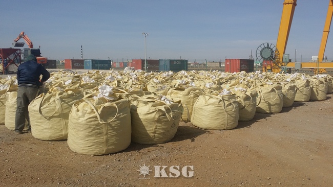 | ▲가공된 상급의 형석광물이 포장용기인 톤백에 가득 적재돼 야적장에 장치돼 있다. |