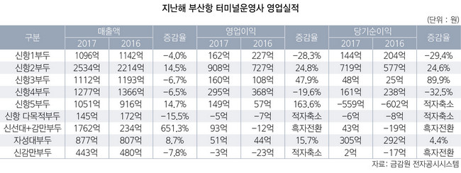 지난해 부산신항 터미널운영사들의 영업실적이 얼라이언스 재편 영향으로 희비가 엇갈렸다. 금융감독원에 따르면 신항 5개 터미널운영사 중 플러스 성장을 신고한 곳은 3곳이었다.