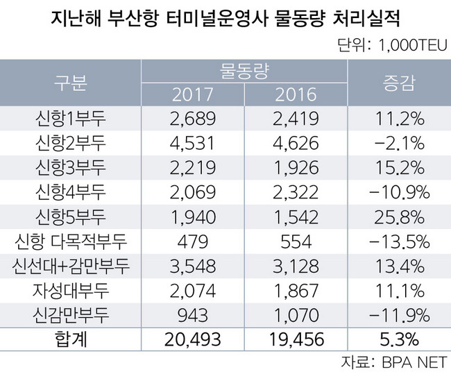 북항은 신선대부두와 감만부두의 통합법인인 부산항터미널(BPT)과 자성대부두(HBCT)의 영업실적 호조세가 두드러졌다. BPT는 부두 통합 시너지, 유휴선석 반납, 임대료 감면, 물동량 증가분 등이 더해져 폭발적인 성장세를 기록했다.