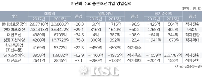 성동조선과 더불어 연간 1조원대 매출을 올렸던 STX조선해양 역시 외형 축소를 피할 수 없었다. 2000년대 후반 4조원대 연매출을 올리며 전 세계 수주량 ‘톱 5’에 포함됐던 이 조선사의 외형은 지속적으로 쪼그라들고 있다. 2016~2017년 수주량이 크게 감소한 게 실적악화로 이어졌다.