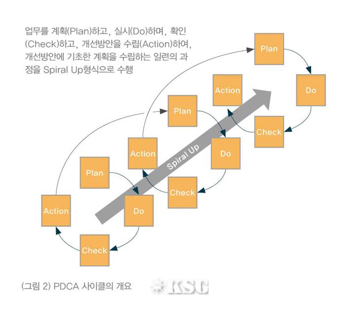 더욱이 이러한 과정은 단 한번의 사이클이 아니라 계획을 세우고, 실제로 하고, 보고, 결과를 확인하고, 실제의 상황을 개선하고, 개선한 결과에 기초해 계획을 세우는 SPIRAL UP을 통해서 일의 성과를 내는 것이 PDCA 사이클이다.