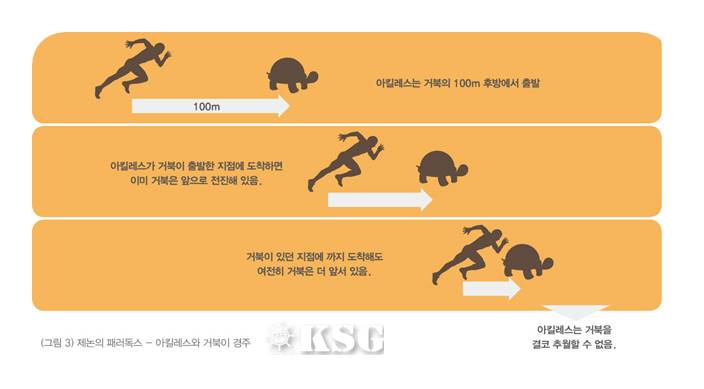 이것은 마치 아킬레스와 거북이로 유명한 제논의 패러독스를 떠올리게 한다. (그림 3)에서 처럼 아킬레스와 거북이가 경쟁을 하고, 아킬레스는 거북 100미터 뒤에서 쫓아가는 경기를 상상해보자. 아킬레스가 거북의 출발선에 도달했을 때에는 거북이는 벌써 앞으로 나아가고 있다. 거북이 있던 지점에 다시 도달했을 때에는 거북은 더욱 앞으로 나아가고 있다. 거북이가 걸음을 멈추지 않는 한 아킬레스가 절대로 거북이를 따라잡을 수 없다.