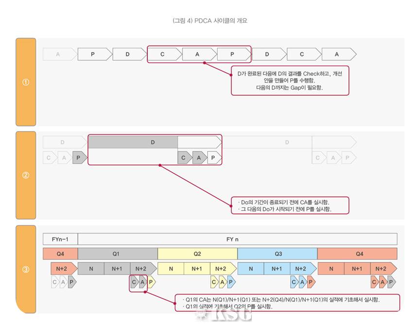 PDCA사이클에서는 (그림4-①) 처럼 이전 사업활동(D)과 다음 사업활동(D) 사이에 C→A→P가 필요하기 때문에 GAP이 생기게 된다. 그러나 실제로 기업의 사업활동(D)은 PDCA 사이클 안에서 C→A→P를 실시하기 위한 GAP이 없이 사업활동(D)을 지속적으로 수행한다. 실제로는 (그림4-②) 처럼 사업활동(D) 실시 중에 C→A→P를 하게 된다. PDCA 사이클의 사고방식을 계속하는 사업 활동(D)에 대해서는 정기적인 타이밍으로 C→A→P를 실시하면서 사업활동(D)의 방향성을 변경할 수 있다는 인식을 고칠 필요가 있다.