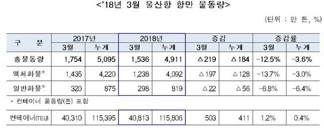전체 화물의 80.6%를 차지하는 액체화물은 1238만t을 처리하는 데 그쳐 전년 동월 대비 13.7% 감소했다. 특히 원유와 석유정제품이 각각 16.2% 17.2%씩 급감한 게 실적 침체에 영향을 미쳤다. 계절적으로 석유제품 수요 감소시기와 정유사 정기보수가 맞물리면서 원유 미 석유정제품을 중심으로 물동량이 감소한 것으로 알려졌다. 설비가동률이 정상화되는 2분기가 지나면 수요가 증가하는 만큼 액체물동량은 지난해 수준으로 회복될 전망이다.