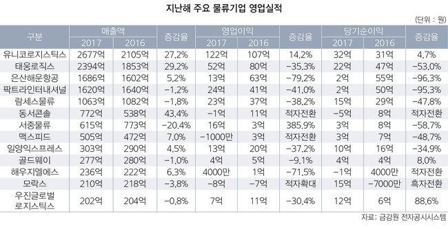 뒤이어 태웅로직스는 외형성장에 성공했지만 수익성이 악화됐다. 태웅로직스의 지난해 매출액은 2394억원으로 전년 대비 29.2% 급증했다. 하지만 영업이익에선 52억원을 거두는 데 그쳐 2016년 대비 35.3%의 역신장세를 기록했다. 당기순이익도 22억원에 머물러 전년 대비 53% 급감했다.
