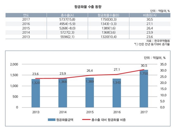 이는 국내 총수출이 같은 기간 0.9% 증가한 데 비하면 월등히 높은 수치다. 지난해 항공 수출액은 전년 대비 30.3% 폭증한 1750만달러(약188억4000만원)였다. 총수출에서 차지하는 비중은 2013년 23.6%에서 지난해 30.5%로 6.9%포인트 상승했다.