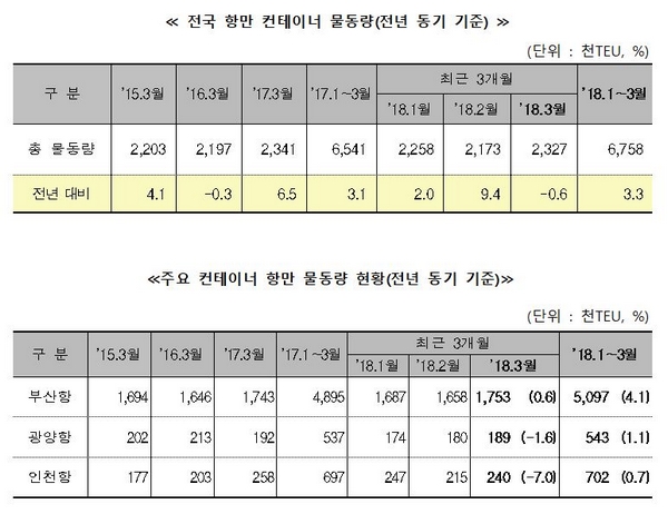 올해 1분기 전국 항만물동량 실적이 전년 대비 6.9% 감소한 가운데, 컨테이너 물동량은 3% 이상 증가하며 오름세를 탔다.