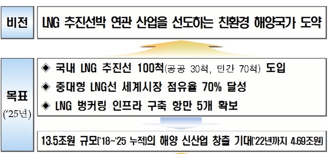 정부는 ▲국내 LNG추진선 100척 도입 ▲중대형 LNG선 세계시장 점유율 70% 달성 ▲LNG벙커링 인프라 구축 항만 5개 확보 등을 2025년까지 달성한다는 목표다. 이를 통해 2025년까지 13조5000억원 규모의 해양신산업이 창출될 것으로 기대했다.