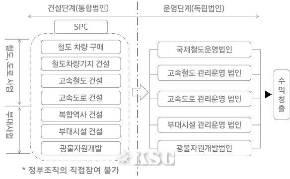 다만 건설단계에서 정부조직이 직접 참여하지 않는 통합법인을 구성해 철도차량 구매부터 철도차량기지 건설, 고속철도 건설, 고속도로 건설과 함께 복합역사 건설, 부대시설 건설, 광물자원개발 등을 협업할 수 있다고 봤다. 나아가 국제철도운영법인, 고속철도관리운영법인, 고속도로관리운영법인, 부대시설관리운영법인, 광물자원개발법인을 각각 독립법인으로 운영해 수익창출이 가능할 것으로 내다봤다.