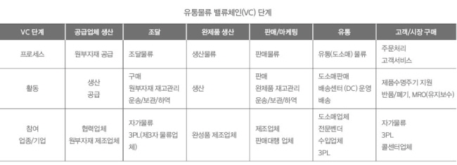 유통물류 밸류체인은 ① 협력업체에 의해 원부자재의 생산 및 공급이 이루어지는 공급업체 생산 단계 ② 3PL 혹은 자가물류에 의해서 구매, 원부자재 재고관리, 운송, 보관 등 조달물류 프로세스가 이루어지는 조달 단계 ③ 제조기업에 의해서 생산물류가 이루어지는 완제품 생산 단계 ④ 제조업체, 판매대행 업체, 3PL에 의해서 판매물류가 이루어지는 판매 및 마케팅 단계 ⑤ 도소매업체, 수입업체, 3PL 등에 의해서 도소매 판매, 배송센터 운영 등 유통물류가 이루어지는 유통단계 ⑥ 3PL, 콜센터 등에 의해서 제품수명주기 지원, MRO 등 주문처리 및 고객서비스 프로세스가 이루어지는 고객 및 시장 구매 단계로 이루어진다.