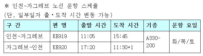 대한항공은 주 3회 취항하는 인천-자그레브 노선이 매주 화요일 목요일 토요일에 편성됐으며, 인천에서 오전 11시5분에 출발해 자그레브 국제공항에 현지시간 오후 3시45분에 도착한다고 밝혔다. 편명은 ‘KE919’다. 인천향(KE920)은 자그레브에서 현지시간 오후 5시20분에 출발해 다음 날 오전 11시30분 인천에 도착한다. 총 비행시간은 약 11시간30분으로, 218석 규모의 A330-200 항공기가 투입된다.