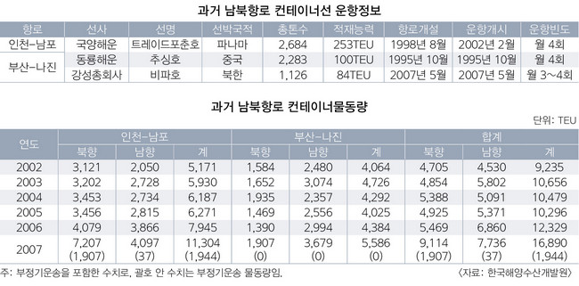 남북항로는 부산과 인천을 거점으로 나진·남포를 잇는 노선이 천안함 사태 전까지 운항했다. 동룡해운과 북한 강성총회사가 부산-나진 항로, 국양해운이 인천-남포 구간을 운항했다. 2007년 기준 남북을 오간 컨테이너는 1만7000TEU를 조금 못 미쳤다.