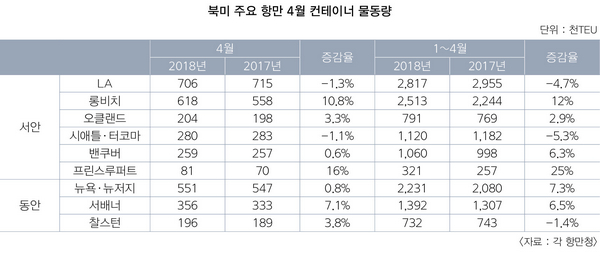 북미 서안 7개 항, 동안 3개 항의 물동량 합계는 각각 214만8000TEU 110만TEU로 전년 대비 3%씩 상승했다. 전체 항만 중 캐나다의 프린스루퍼트항이 가장 높은 성장률을 기록했고 로스앤젤레스(LA)항은 실적 부진을 경험했다.