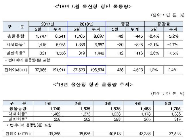일반화물은 319만t을 기록해 지난해 대비 3.6% 감소했다. 미국의 철강쿼터제 영향으로 5월 철강 및 그 제품의 물동량은 47% 급감한 20만t에 그쳤다. 기계류 및 그 부품도 58.8% 후퇴했다. 비철금속 및 그 제품은 108% 폭증했다.