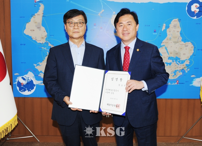 | ▲김영춘 해양수산부 장관은 2일 황호선 해양진흥공사 초대 사장에게 임명장을 수여했다. |
