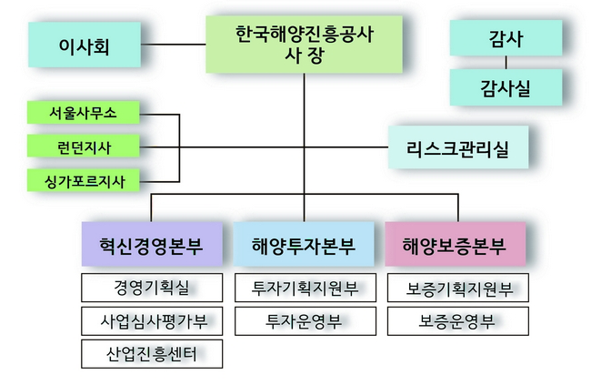 혁신경영본부는 상임이사, 해양투자본부장과 해양보증본부는 임원급인 1급 개방형 공모직에서 각각 본부장을 맡는다. 산하 부서 중 경영기획실만 1급 직원이 부서장을 맡고 나머지는 2급 직원이 각각 책임지게 된다. 4명의 임원과 1명의 1급 실장, 8명의 2급 실·부장 체제다.