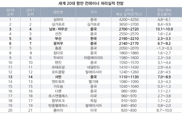 2018년 항만별 처리실적을 보면, 닝보·저우산이 세계 3위로 순위가 한 계단 상승, 선전을 4위로 밀어낼 전망이다. 홍콩의 하락세도 눈에 띈다. 홍콩이 5위에서 7위로 미끄러지며 부산과 광저우의 순위 상승이 이뤄질 것으로 보인다.