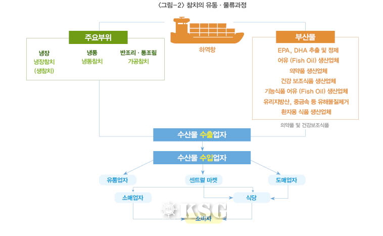 이제 참치는 단순히 초밥이나 횟감 그리고 통조림으로만 소비되지 않는다. 과학기술의 발달로 참치의 부산물은 <그림-2>처럼 약품, 화장품, 건강식품 등 다양한 상품으로 진화하고 있다. 만약 참치가 물류를 만나지 못했다면 아직 참치는 고양이 사료나 쓰레기장 애물단지 신세를 못 벗어나고 있을 것이다. 물류를 통해 참치는 세계인들의 입맛을 돋우었고 이는 또 다른 물류시장의 성장을 주도했으며 다양한 참치의 활용도 가능하게 된 것이다. 요즘 남획으로 인한 참치 멸종에 대한 우려가 많아지고 있다. 우리의 생활을 풍요롭게 한 참치의 멸종은 매우 슬픈 일이며 있어서는 안 되는 상황이다. 현재 국가간 협약을 통해 쿼터 내에서 참치를 잡도록 규정화하고 양식 등의 대안도 등장하고 있다. 그리고 보다 효과적이고 효율적인 참치 물류체계를 구축해 유통과정에서 손실되거나 폐기되는 부분이 없도록 우리 모두의 노력이 필요한 시점이다.