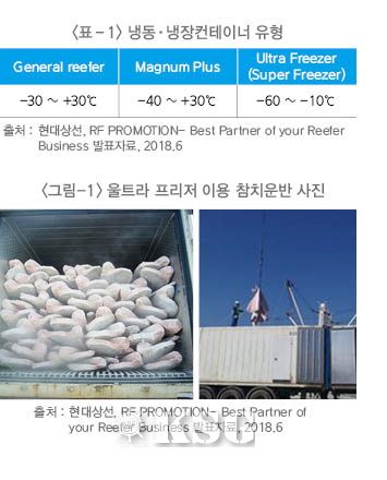 울트라 프리저(Ultra Freezer) 혹은 수퍼 프리저(Super Freezer)라고 불리는 냉동·냉장컨테이너는 선박이 참치 혹은 온도민감 화물들을 전세계로 보내는데 큰 역할을 하고 있다. 장시간 이동에서 수산물의 질을 그대로 유지해 줄 수 있는 비싼 항공대신 해운을 통한 수송이 가능해졌다. 냉동·냉장 컨테이너는 아래 표와 같이 크게 3가지 유형으로 구분할 수 있다. 일반 리퍼, 매그넘 플러스 그리고 울트라 프리저로 구분될 수 있다. 횟감으로 사용되는 고급 참치는 대부분 울트라 프리즈를 통해서 글로벌 물류가 진행된다(<그림-1> 참조).