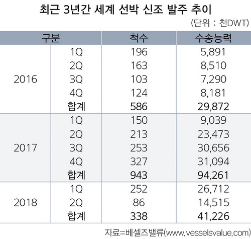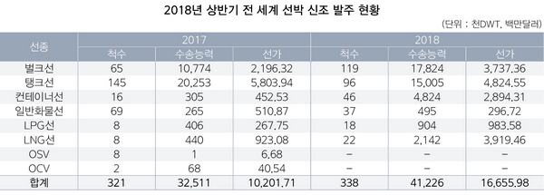 영국 해운조사기관인 베셀즈밸류에 따르면 올해 상반기 전 세계 선박 신조 발주 실적은 338척 4123만t(이하 재화중량톤)으로, 지난해의 321척 3251만t에서 선복량 기준으로 27% 늘어났다. 선종별로 벌크선 119척 1782만t, 탱크선 96척 1500만t, 컨테이너선 46척 482만t, LNG선 22척 214만t, LPG선 18척 90만t, 일반화물선 37척 49만t 등이다.