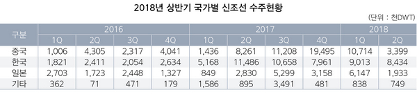 국가별 수주량에선 우리나라가 중국을 앞질렀다. 우리나라는 상반기에 1745만t의 신조선을 수주함으로써 중국을 333만t 차이로 누르고 세계 1위 조선국 지위를 탈환했다. 일본은 808만t의 수주실적을 기록했다. 전년 동기 대비 증가율에선 일본이 120%, 중국이 46%를 보인 반면 우리나라는 5%에 머물렀다.