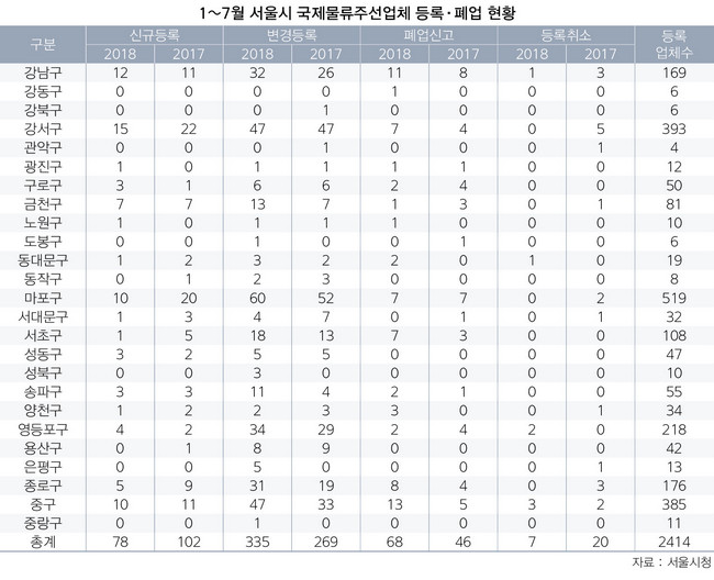 서울시청의 직권으로 등록취소를 당해 영업을 할 수 없게 된 업체는 7곳이었다. 중구가 3곳으로 가장 많았고, 영등포구가 두 곳, 강남구와 동대문구가 각 1곳이었다. 지난해 1~7월 20곳과 비교하면 대폭 줄어든 수치다. 등록취소는 포워더의 기본 자본금인 3억원을 충족하지 않거나, 1억원 한도를 보장하는 화물배상책임보험이나 보증보험에 가입하지 않았을 때 해당된다.