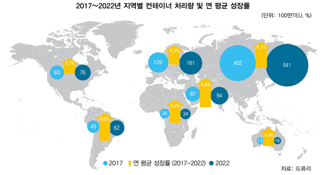 향후 높은 물동량을 기록할 것으로 예상되는 지역으로는 중국을 비롯한 북아시아, 동남아시아, 남미 서안이 꼽혔다. 이중 아시아 항만이 5억4000만TEU로 가장 많은 화물을 처리할 것으로 전망됐다.