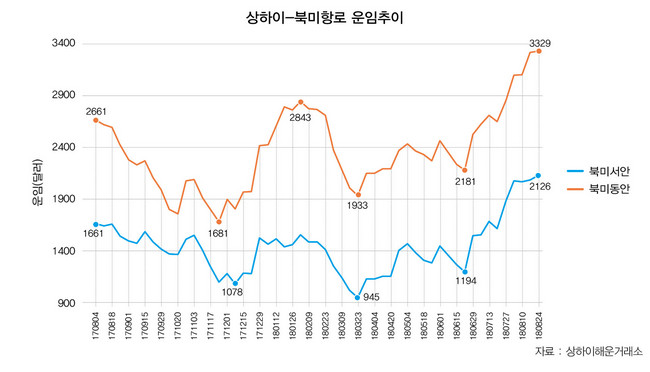 중국발 북미항로의 운임은 6월 하순부터 매주 상승세를 이어오고 있다. 상하이해운거래소에 따르면 8월24일 상하이발 북미서안행 운임은 FEU(40피트 컨테이너)당 2126달러로 연중 최고치를 기록했다. 미 서안행 운임이 2100달러를 돌파한 건 1년7개월 만이다. 3월 한때 900달러 중반까지 뒷걸음질 쳤던 북미서안행 해상운임은 6월22일 1194달러를 기점으로, 1500달러 1600달러 1800달러 2000달러 순으로 급격한 상승세를 이어오며 약 1000달러 이상 인상됐다.
