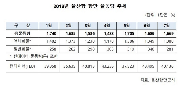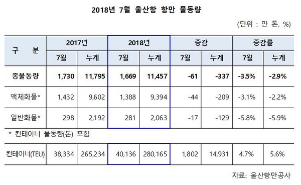 컨테이너를 제외한 액체 일반 자동차 화물은 모두 감소세를 보였다. 울산항에서 가장 많은 비중을 차지하는 액체화물은 1388만t으로 지난해보다 3.1% 감소했다. 화학공업생산품과 석유가스류가 전년 대비 각각 40.3% 5% 증가하면서 실적을 견인했다. 일반화물은 280만t을 처리하며 지난해보다 5.8% 감소했다. 전기동 아연괴 등 비철금속류와 플라스틱 고무 등은 증가세를 유지하고 있지만, 자동차 및 차량부품의 경우 대미 수출 부진으로 하향곡선을 그렸다.