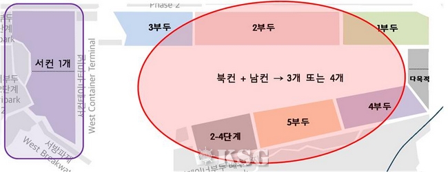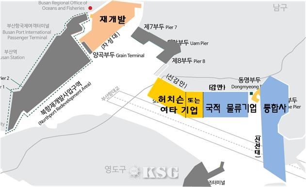 북항의 터미널은 3개에서 2개로 축소된다. 이를 위해 지난 2016년 신선대와 감만 터미널 운영사(CJ대한통운, 부산인터내셔널터미널)를 축소한 데 이어 신감만 동부부산컨테이너터미널도 오는 2019년 6월까지 추가로 통합, 한국해운연합(KSP) 하역사 부산항만공사로 구성된 통합 운영사가 설립된다는 구상이다.