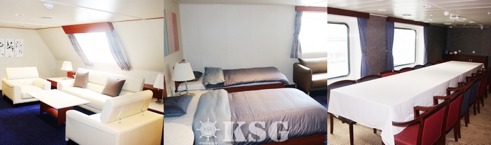 | ▲<뉴골든브리지7>호의 내부 여객시설. 왼쪽부터 VIP실과 고급 2인실, 레스토랑 |
