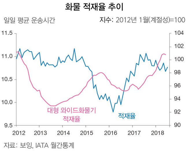 대형화물기(와이드화물기)의 일일 운송시간은 약 11시간으로, 올해를 포함한 7개년 수치를 놓고 보면 최대치였던 2012년과 비슷한 수준이다. 항공기 연료로 사용되는 제트유 가격은 현재 t당 80~100달러 사이에 형성돼 있으며, 1년 전과 비교해 40% 이상 급등했다.