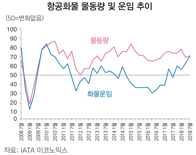 세계 교역에서 항공시장이 차지하는 비중은 2016년부터 2017년 중반까지 9개월 이상 안정적인 흐름을 보였다가 최근들어 점차 하향화되고 있다. 세계 각국이 보호무역 조치로 문을 걸어 잠그면서, 교역 성장세가 약세로 돌아섰다는 게 IATA의 분석이다.
