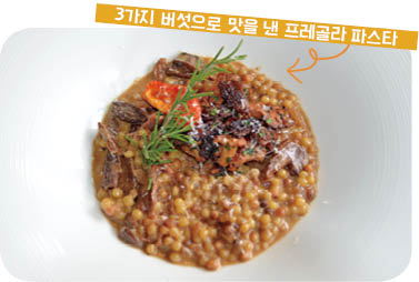 ‘3가지 버섯으로 맛을 낸 프레골라 파스타’는 노란색을 띤 야생버섯인 지롤(girolles), 황토색의 그물모양의 모렐(morel)버섯 그리고 향이 좋고 고기 같은 질감과 숲 속의 향을 간직한 포르치니(dry porcini)버섯을 이용하여 접시에 담아보았다. 먼저 건포르치니 버섯을 뜨거운 물에 담가 불리는데 물은 버리지 않고 육수로 사용한다. 3시간 정성스럽게 끓인 닭육수와 포르치니국물을 섞어서 프레골라 파스타에 향이 스며들도록 익힌다. 프레골라가 계속 촉촉하도록 육수를 조금씩 부어주고 파스타가 어느 정도 익으면 3가지 버섯을 넣고 버섯 향을 극대화 시킨 후 생크림을 살짝 부어주면 완성된다. 생크림은 센불에서 넣으면 분리되므로 약한 불이나 불에서 내린 후 파스타와 버섯이 살짝 코팅 되도록 아주 조금만 넣어주면 된다.