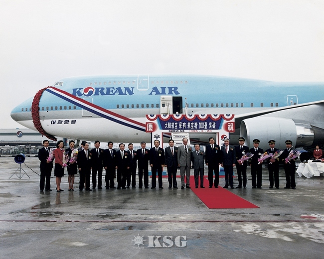 | ▲ 대한항공은 1995년, 민항출범 26년만에 보유항공기 100대를 돌파하며 세계 항공사로 발돋움하는 계기를 마련하였다. 사진은 1995년 3월 24일, 100번째 대한항공이 보유하게 된 항공기인 보잉 747-400을 배경으로 관계자들이 기념 촬영을 하고 있는 모습. |