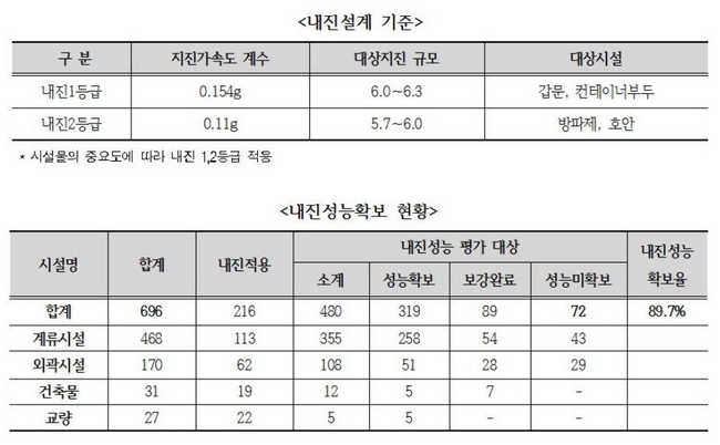 이는 국토교통부가 직접 관장하는 도로·철도 등 사회간접자본(SOC) 시설의 경우 지난해 11월까지 전체 2만3315곳 중 96%에 해당하는 2만2377개 시설이 내진 성능을 확보했으며, 성능이 미확보된 938곳은 사업비를 집중 투자해 내년까지 내진 보강률 100%를 달성하겠다고 밝힌 것과 비교된다는 지적이다.