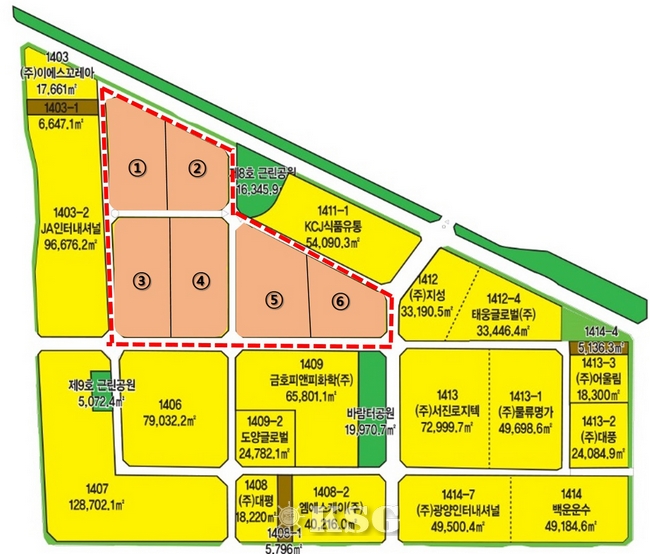 | ▲ 광양항 서측배후단지 조감도 (①~⑥이 이번 모집대상 구역) |
