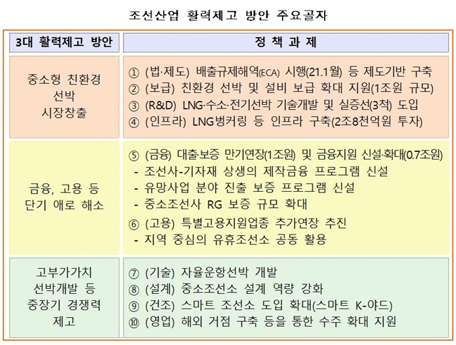 이번 활력제고 방안은 중소조선사와 기자재업체를 대상으로 금융·고용 등 당면 애로 해소와 함께, 배출규제해역 지정 등 친환경으로의 규제혁신을 계기로 LNG선, 저감장치(스크러버) 등 새로운 시장과 일감 확보에 중점을 뒀다.