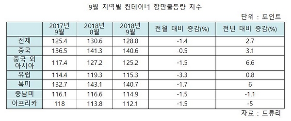 영국 해운분석기관 드류리에 따르면, 지난 9월 전 세계 컨테이너항만물동량지수(GCPTI, Global Container Port Throughput Index)는 128.8을 기록, 전년 동월 대비 2.7% 상승했다.