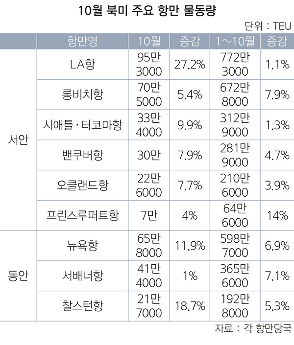 북미 지역 주요 컨테이너 항만들의 물동량이 일제히 성장 곡선을 그렸다. 9개 항만의 10월 물동량이 전부 지난해 같은 달보다 증가했다. 누적 실적에서도 같은 결과를 보였다. 각 항만당국은 연말 연휴 시즌을 대비한 소비제품 물량 급증과 미국의 중국 제품 관세 부과 전 물량 밀어내기 등을 현재 상승세의 주요 원인으로 꼽았다.