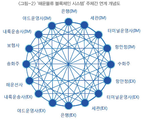 해당 사례는 해외에만 있는 것이 아니고 블록체인 기술의 세계시장의 확산에 긴장한 우리나라 물류업계에서도 삼성SDS, 해양수산부, 관세청, 항만공사, 한국해양수산개발원 그리고 해운물류기업 관계자들이 모여 ‘해운물류 블록체인 컨소시엄’을 결성했다. 해당 컨소시엄은 해운분야 시범사업을 지난해 완료하였으며, 2018년 11월에는 ‘물류 블록체인 협의체’로 더 많은 주체들이 참여하는 해운을 넘어선 물류전체로 확장된 블록체인 기술을 적용하기 위해 모였다. 우리나라 물류분야에 블록체인 기술을 보다 넓은 범위로 확장하고 시범사업을 떠나 실제 사업에 적용을 하기 위해 민관학연의 주체들이 힘을 합친 것이다. ‘해운물류 블록체인 컨소시엄’은 과거 중앙통제체제 하에서 관리되었던 화물정보에 대해 시범사업이지만 <그림-2>에서처럼 다수의 주체가 모든 참여자와 블록체인 기술을 통해 연결되어 감시, 확인, 승인 기능을 동시에 수행할 수 있도록 만든 것이다.