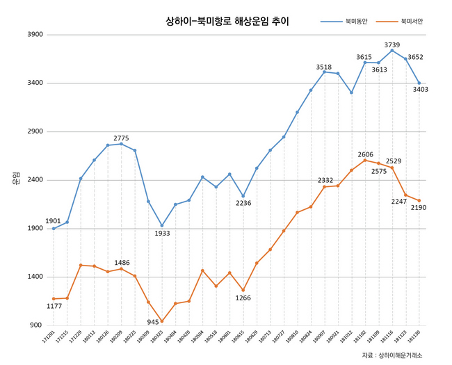 북미동안행 해상운임도 서안과 비슷한 흐름을 보이고 있다. 지난 3월 1900달러대까지 후퇴한 이 항로 운임은 11월16일 3739달러를 기록해 2015년 4월 이후 최고치를 찍었다. 11월30일 상하이발 북미동안행 운임은 3403달러로 조금 주춤한 모습이지만 여전히 강세를 이어가고 있다.
