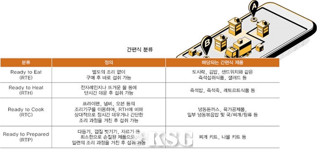간편식은 크게 Ready to Eat(RTE), Ready to Heat(RTH), Ready to Cook(RTC), Ready to Prepare(RTP)의 4가지로 분류하여 볼 수 있다. 간편식의 범위를 살펴보면, 즉석섭취·편의식품류가 보편적인 범위에 해당될 수 있다. 그런데 즉석섭취·편의식품류외에도 냉동만두, 카레, 피자, 핫도그, 파스타 등 다양한 제품유형이 간편식의 형태로 출시되고 있어 최근에는 간편식의 범위가 더욱 넓어지고 있는 추세다.