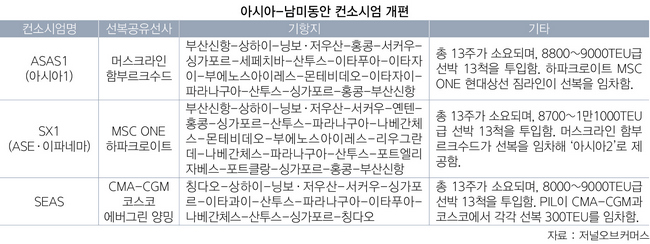 아시아-남미동안 항로의 컨소시엄 재편이 속속 마무리되면서 주요 선사들이 개편된 서비스를 알리고 있다. 신규 선복공유협정(VSA) 컨소시엄은 총 3개로, 머스크·함부르크수드, 하파크로이트·오션네트워크익스프레스(ONE)·MSC, CMA-CGM·코스코·에버그린·양밍 등이다.