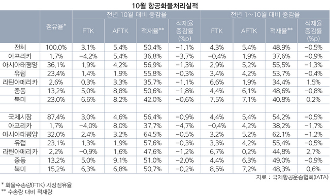 36.1%의 점유율로 세계 최대 화물시장인 아시아태평양지역은 전년 동월 대비 1.9%의 성장률을 거두는 데 그쳤다. 특히 수출입화물 성장세는 2.4%로 5개년 평균치인 4.7%보다 크게 못 미쳤다. IATA는 9월보다 수치가 상대적으로 개선됐지만 연초 성장률과 비교하면 1.2% 낮다고 분석했다.