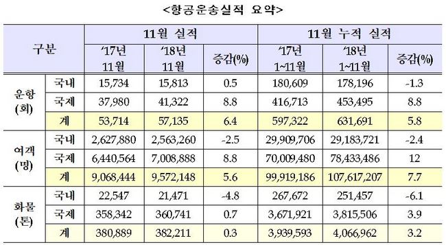 1~11월 누적 여객수송실적은 1억762만명으로 지난해보다 7.7% 늘어났다. 국제선이 12%의 증가세를 보인 것과 달리 국내선은 2.4% 하락했다.